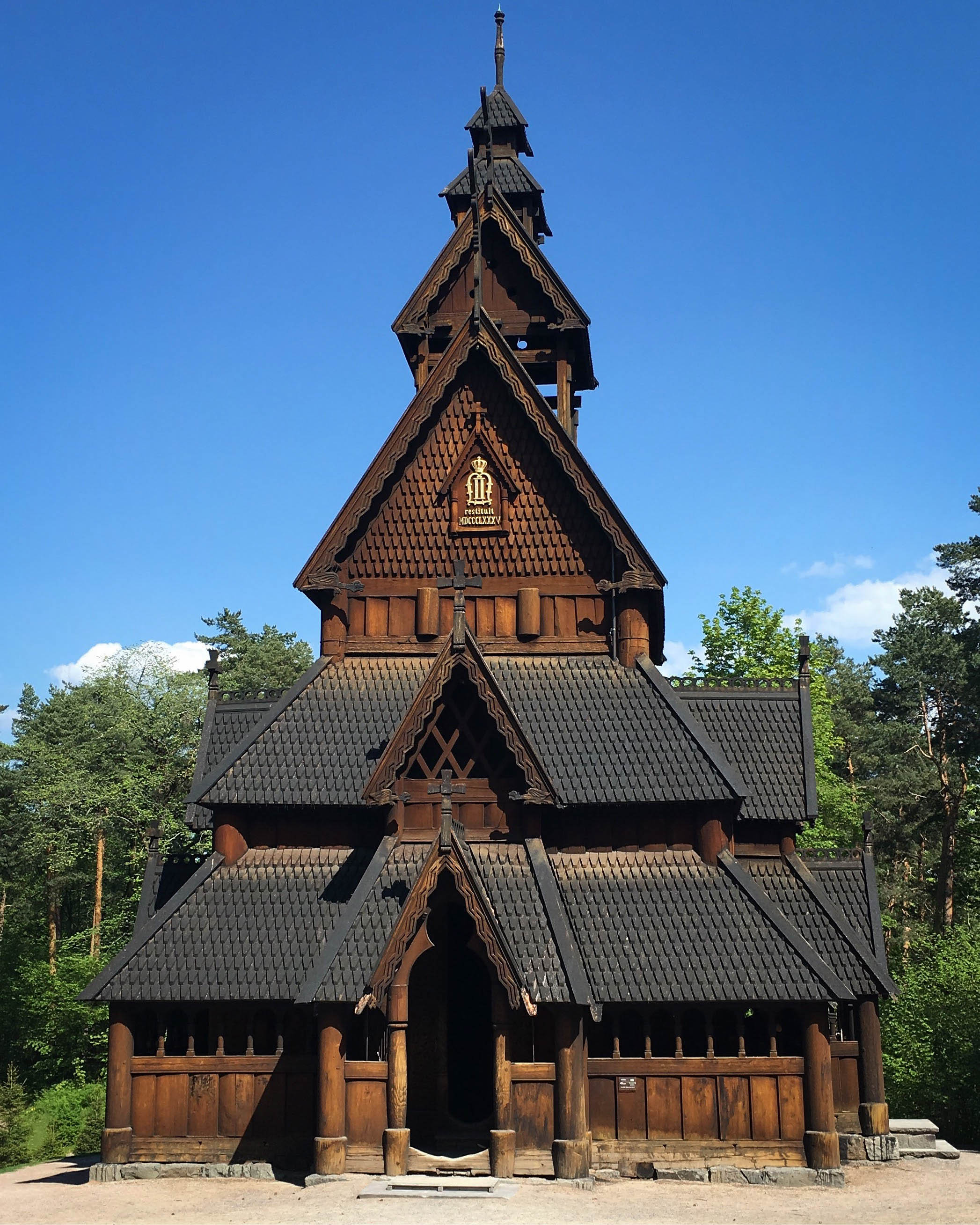 It was every bit as impressive as it had seemed behind the gate. Situated on top of a small hill (because of course there was another hill), the trees parted into a large clearing, and the tiered structure soared up above me, the sunlight catching on the dark wood. The stavkirke was immense in an understated way, and I could immediately understand why they were once used as places of worship. It was a building with presence, a presence I felt as I stepped out of the sun and into its dark interior. I was so glad I hadn’t skipped Bygdøy, if only for this moment.